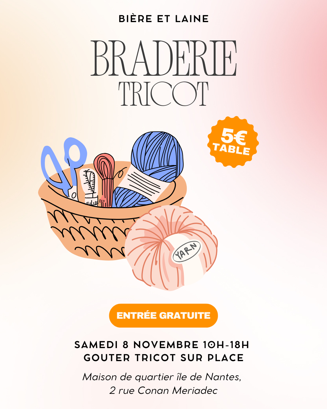 Participez à notre Braderie Tricot le samedi 8 novembre 2025, de 10h à 18h, à la Maison de quartier de l’Île de Nantes.